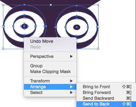 Vytvorené oči zväčšite a presuňte podľa obrázku. Potom ich umiestnite na poslednú vrstvu. Príkazom Arrange.
