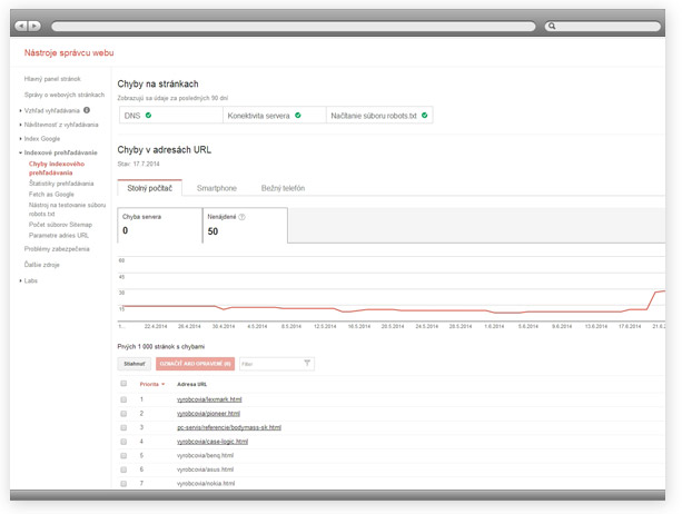 Pomocou nástroja Google Webmaster Tool, konkrétne report Chyb indexového prehľadávania. Tento report je jeden z najdôležitejších, poskytuje zoznam nenájdených stránok, s chybou 404.